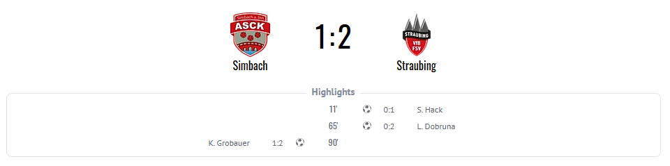 Zum Jahresausklang 2025 musste der ASCK Simbach eine völlig verdiente 1:2 Heimniederlage hinnehmen. Vor knapp 100 Zuschauern bei bestem Fußballwetter bot die Grobauer-Elf im ersten Abschnitt eine indiskutable Leistung und war dem Gast von der ersten Sekunde an hoffnungslos unterlegen. Die Innstädter kamen selten in die gegnerische Hälfte und hatten Glück, dass Straubing reihenweise Chancen vergab. Bereits in der ersten Minute konnte ein Abschluss von Florian Folger im letzten Moment zur Ecke geklärt werden. Die Gäubodenstädter konnten schalten und walten wie sie wollten, das Zweikampfverhalten der Simbacher war mangelhaft und die Pässe landeten meist beim Gegner. Bereits in der 10. Minute die Führung für den FSV/VfB: Lorent Dobruna konnte ohne Gegenwehr gemütlich quer vor dem Strafraum dribbeln, sein Abspiel verwertete Simon Hack mit einem trockenen Schuss unhaltbar ins lange Eck.